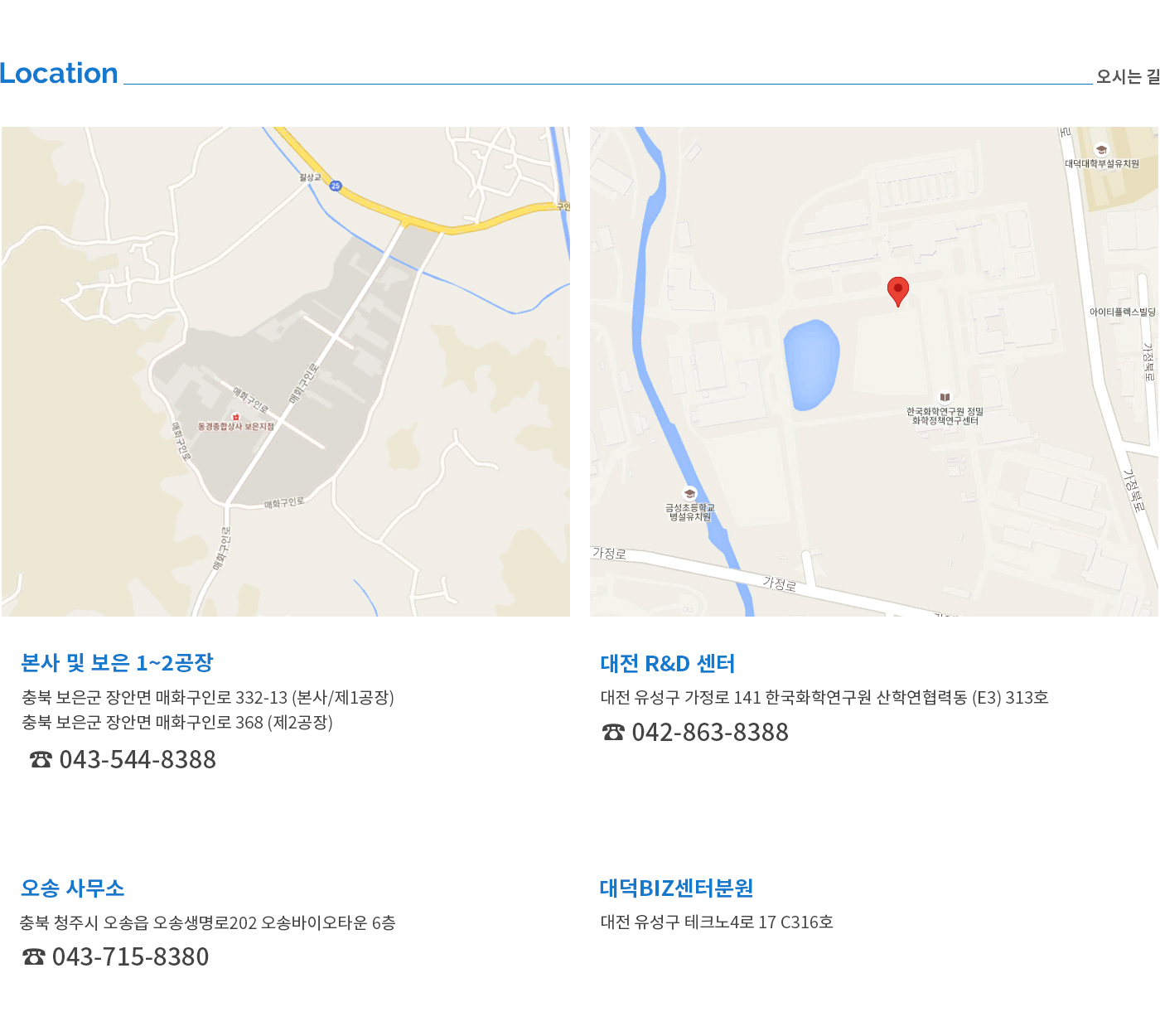 대표이사 : 김태한 ㅣ 본사 및 공장 : 충북 보은군 장안면 매화구인로 332-13 (구인리 182-20번지), 28916 ㅣ 전화 : 043-544-8388/8389 ㅣ 팩스 : 043-544-8390